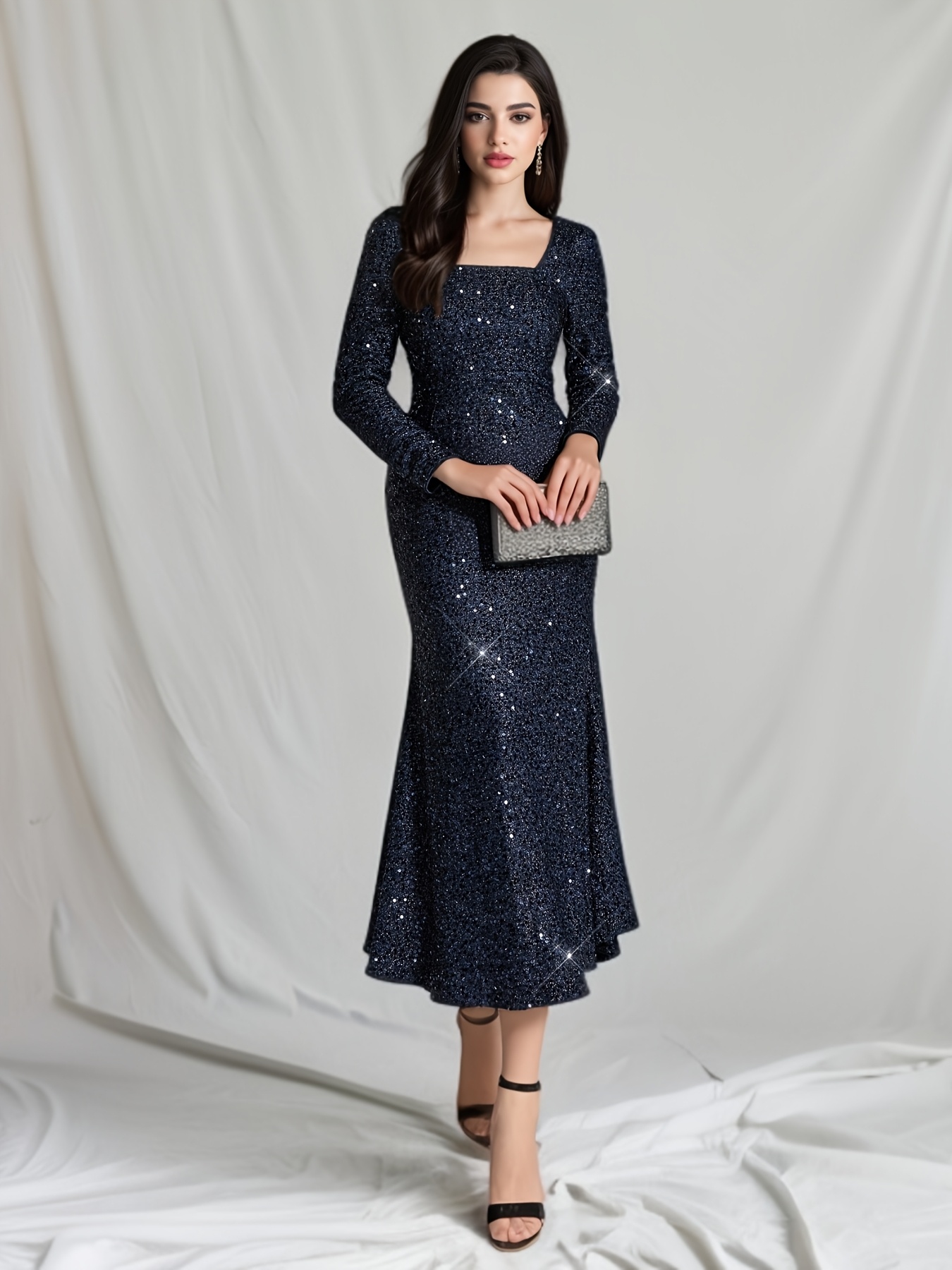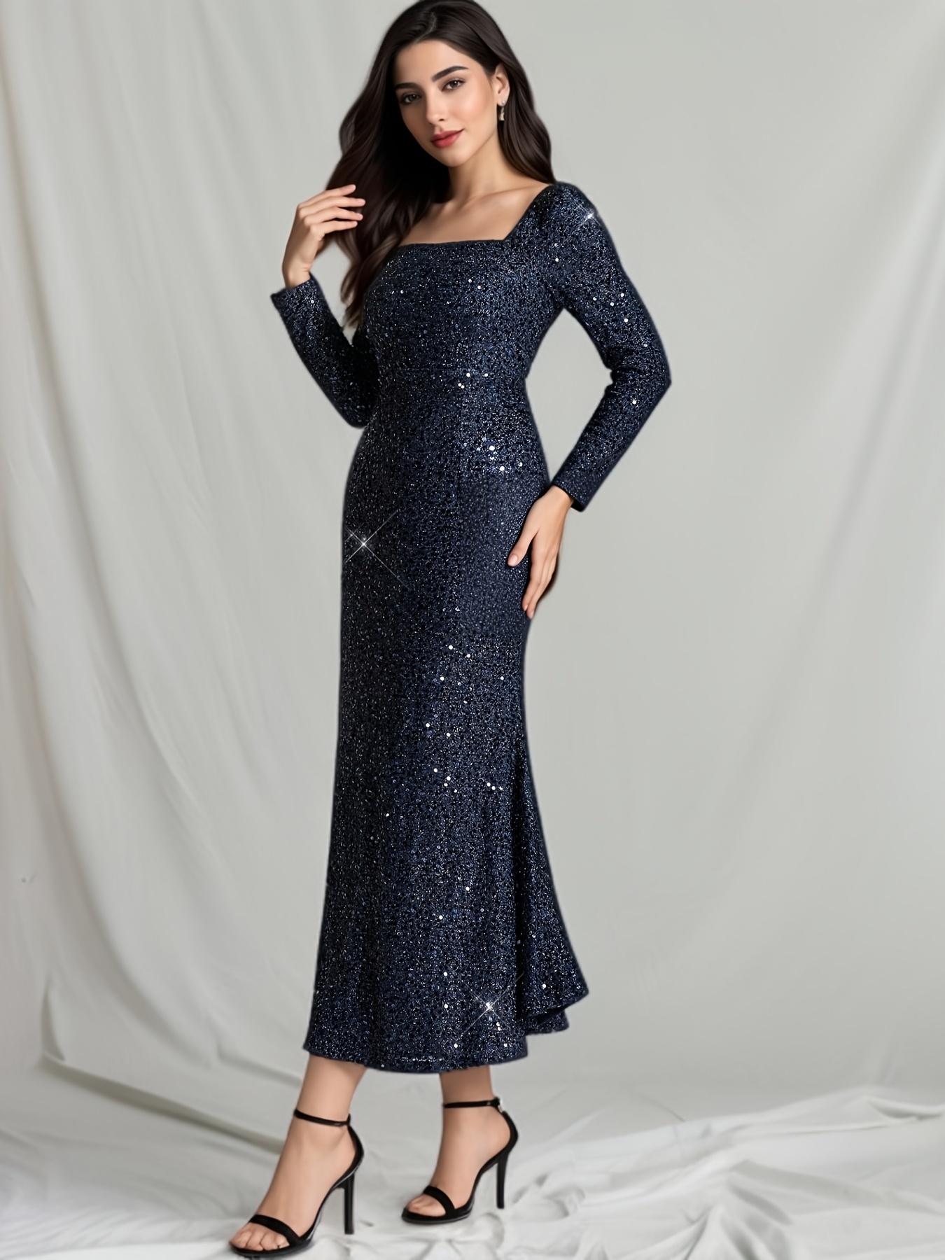 1pc Elegant Sequined Backless Maxi Dress for Women, Polyester Knit Fabric, Square Neckline, Solid Color, Versatile for All Seasons, Mother'S Wedding Party Gown