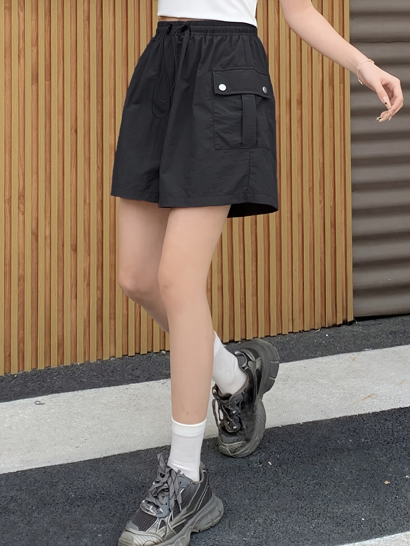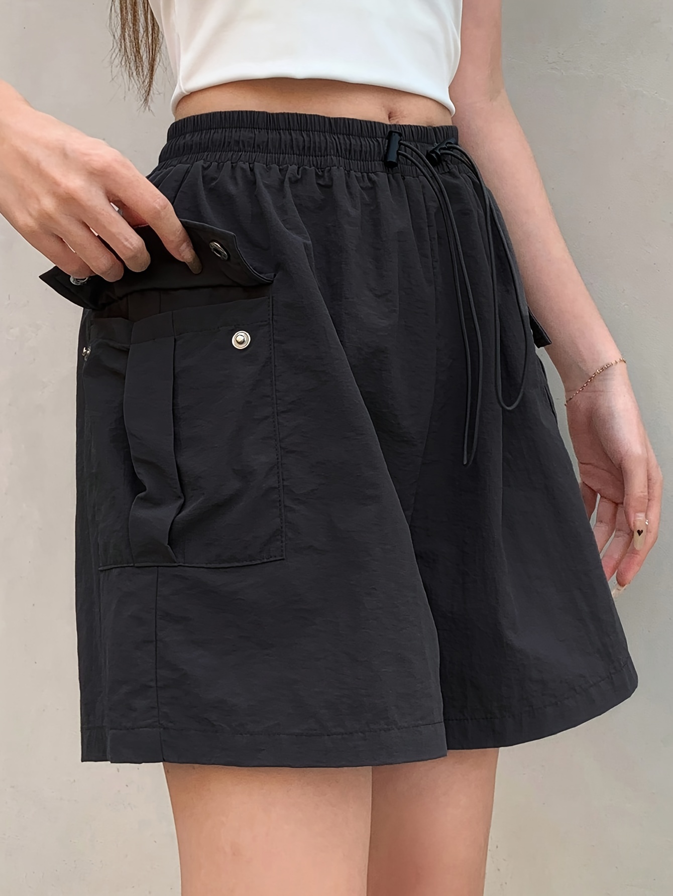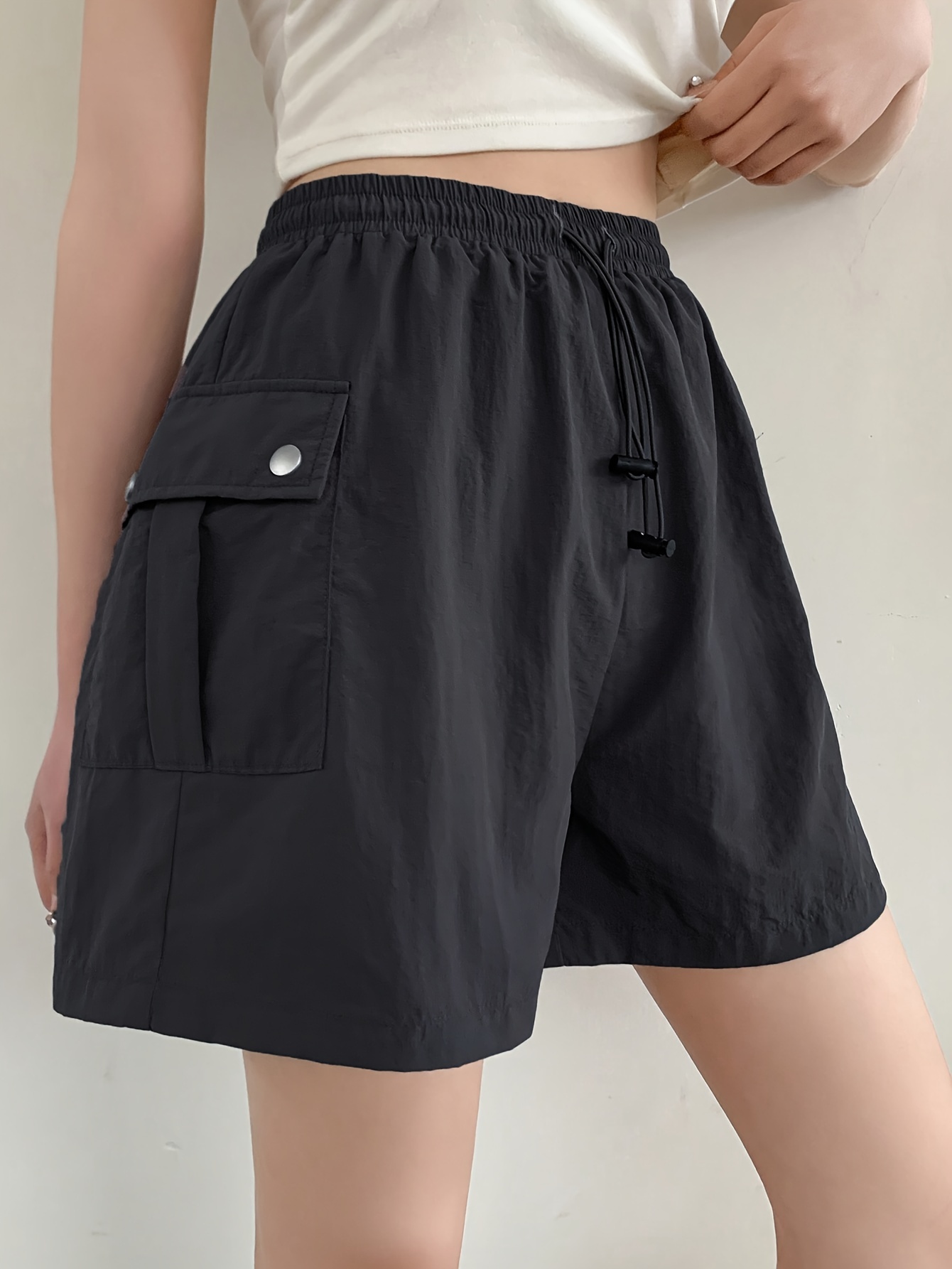Summer Chic Drawstring Cargo Shorts - Comfortable Polyamide Fabric, Machine Washable, Solid Color, Casual Style for Women - Perfect for Outdoor Activities
