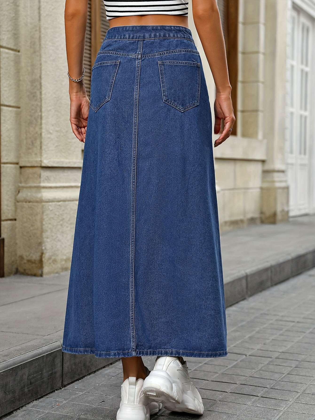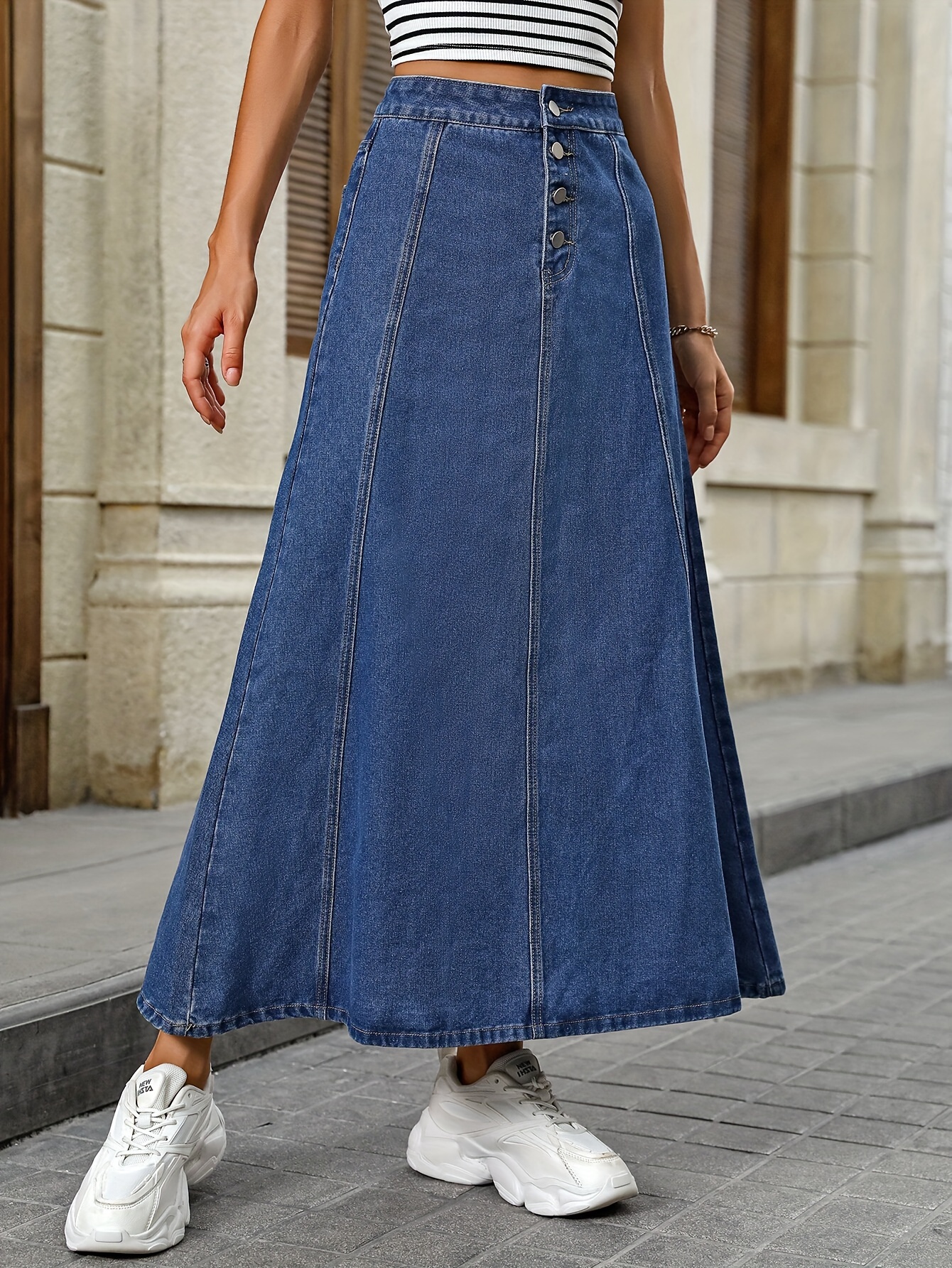 Plain Washed Blue Button Fly Casual Style A-line Maxi Denim Skirt, Women's Denim Jeans & Clothing