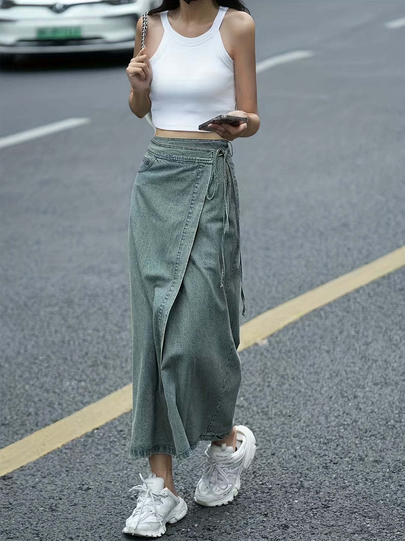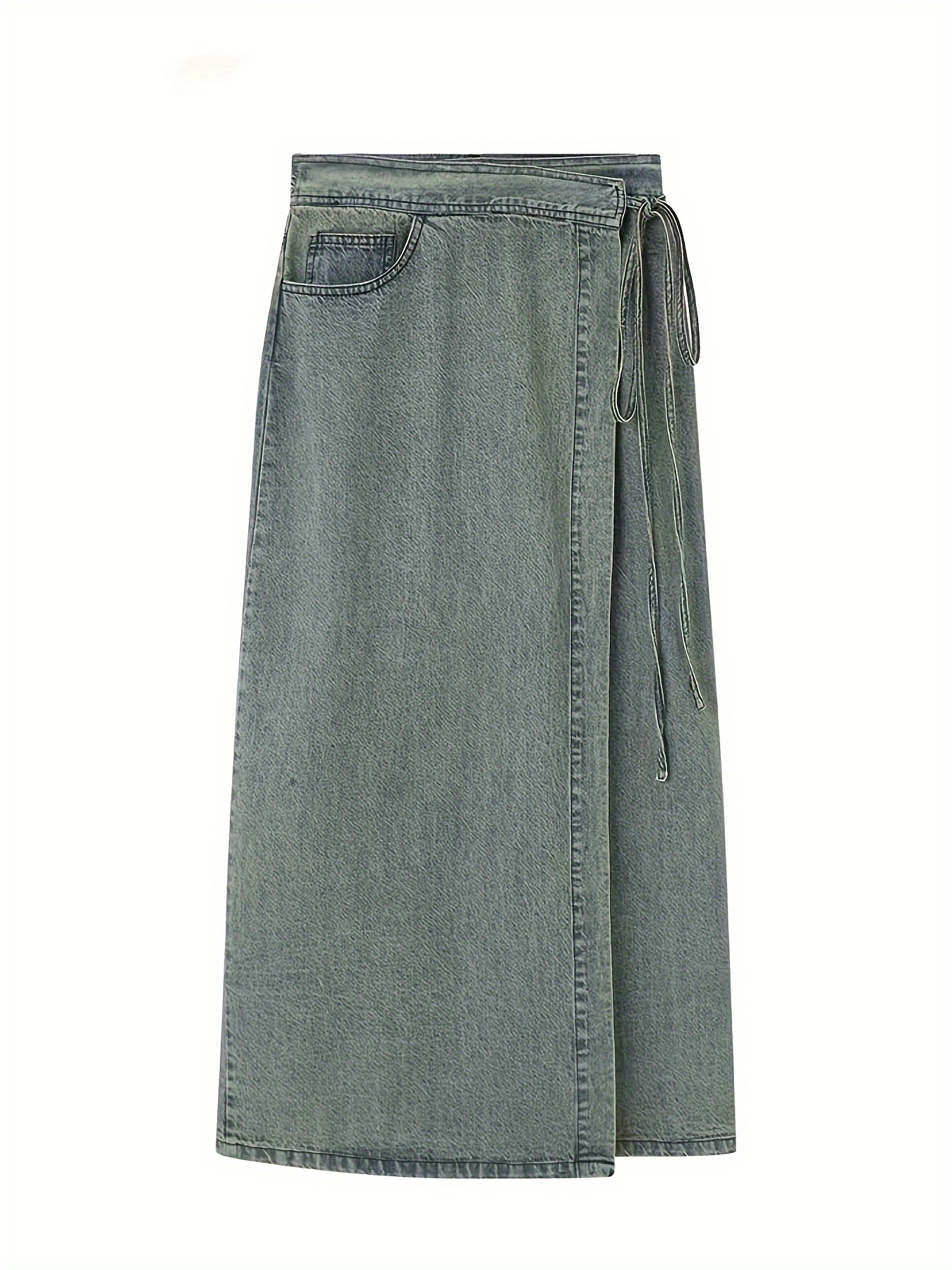 Women'S Elegant Denim Wrap Skirt - High Waist Lace-Up Slit Midi Skirt, Cotton Blend, Geometric Pattern, Woven Fabric, Non-Stretch for Spring/Summer/Fall