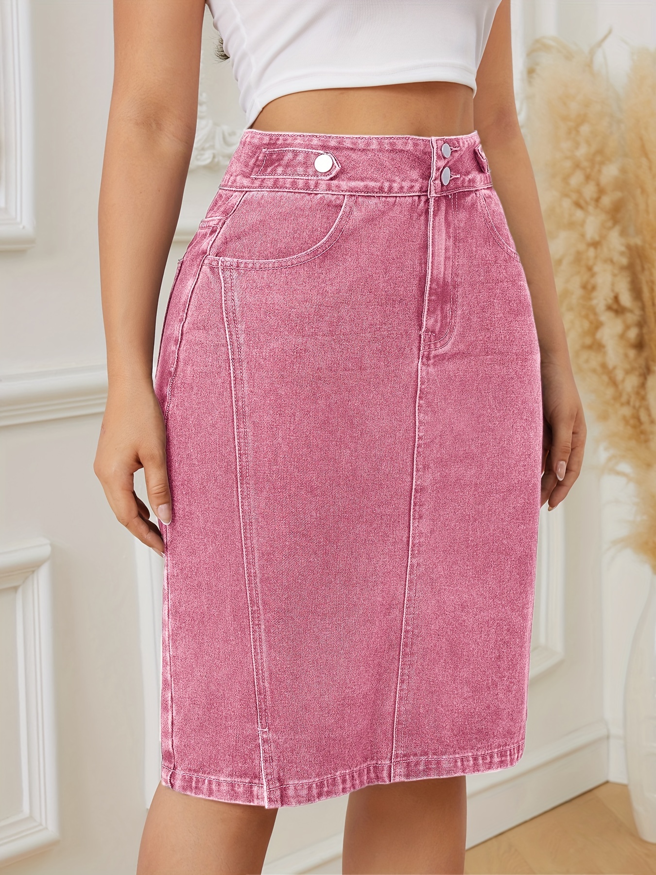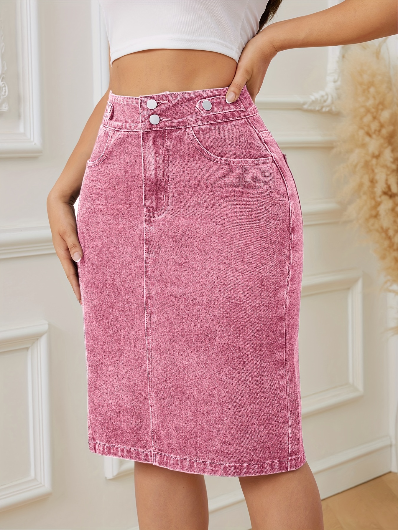 Women's Fashion Pink Denim Skirt - Cotton Blend, Medium Stretch, Solid Color, Sexy Straight Cut with Decorative Fake Buttons, Woven Fabric, Perfect for Spring/Summer/Fall