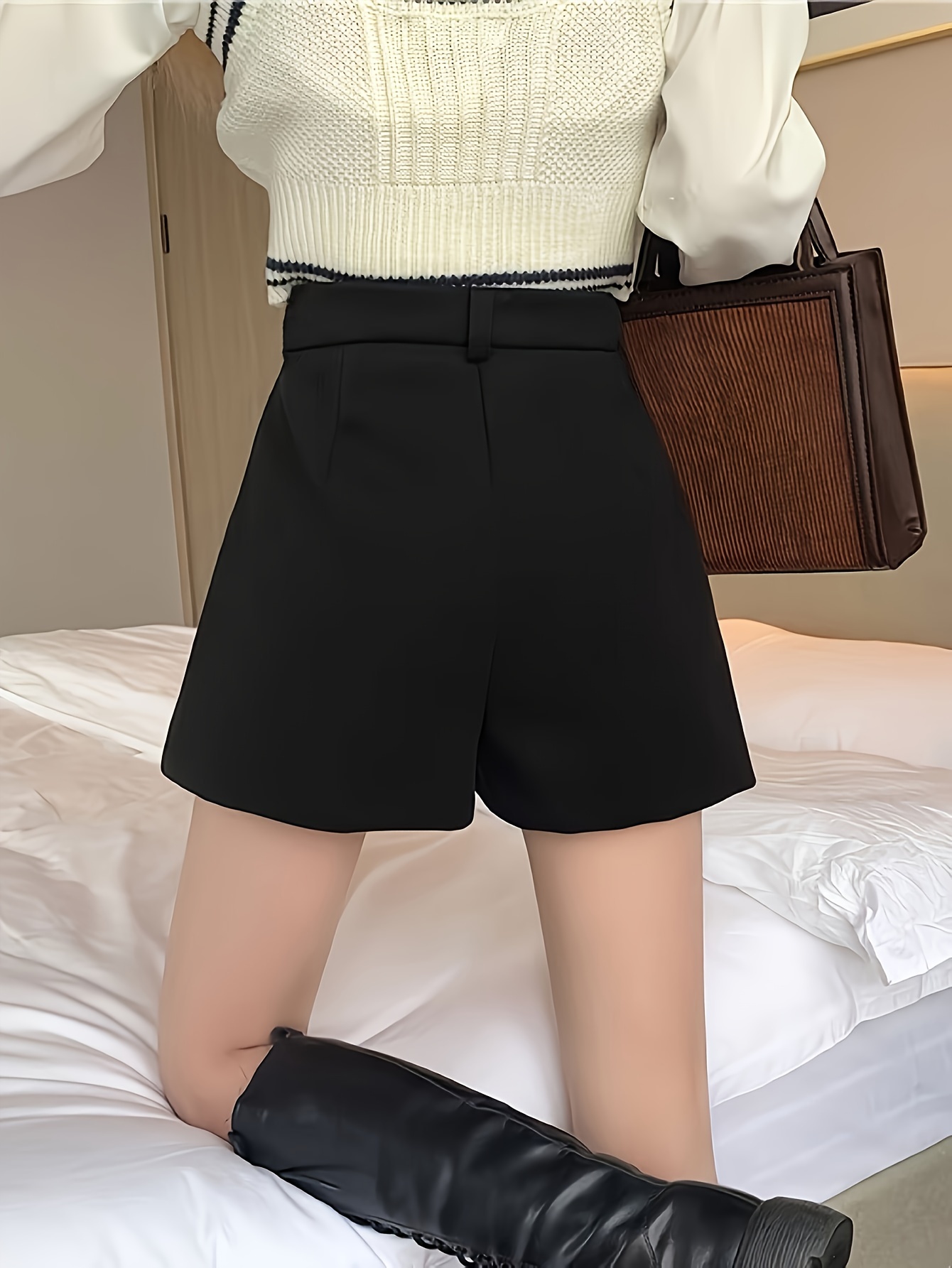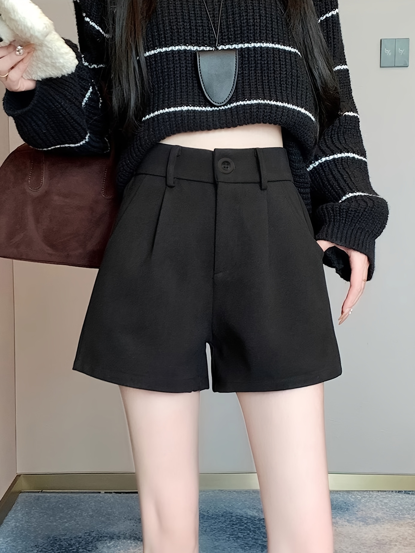 Elegant High-Waist Fleece Shorts for Women - Slimming A-Line Fit, Perfect for Fall & Winter with Pockets