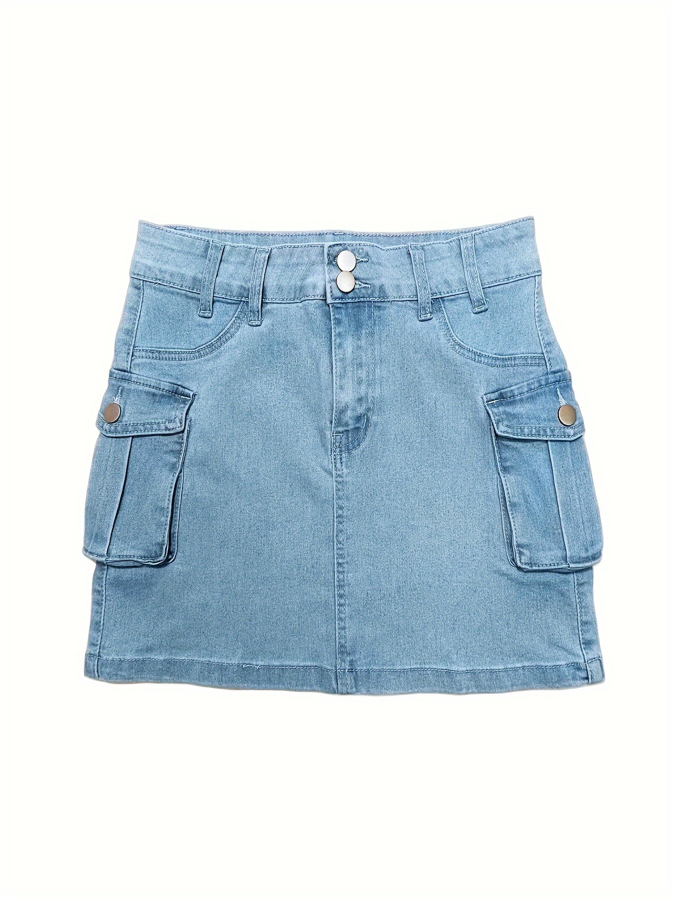 Plain Flap Pockets Cargo Denim Mini Skirt, High Stretch Double Button Washed Denim Skirt, Women's Denim Clothing